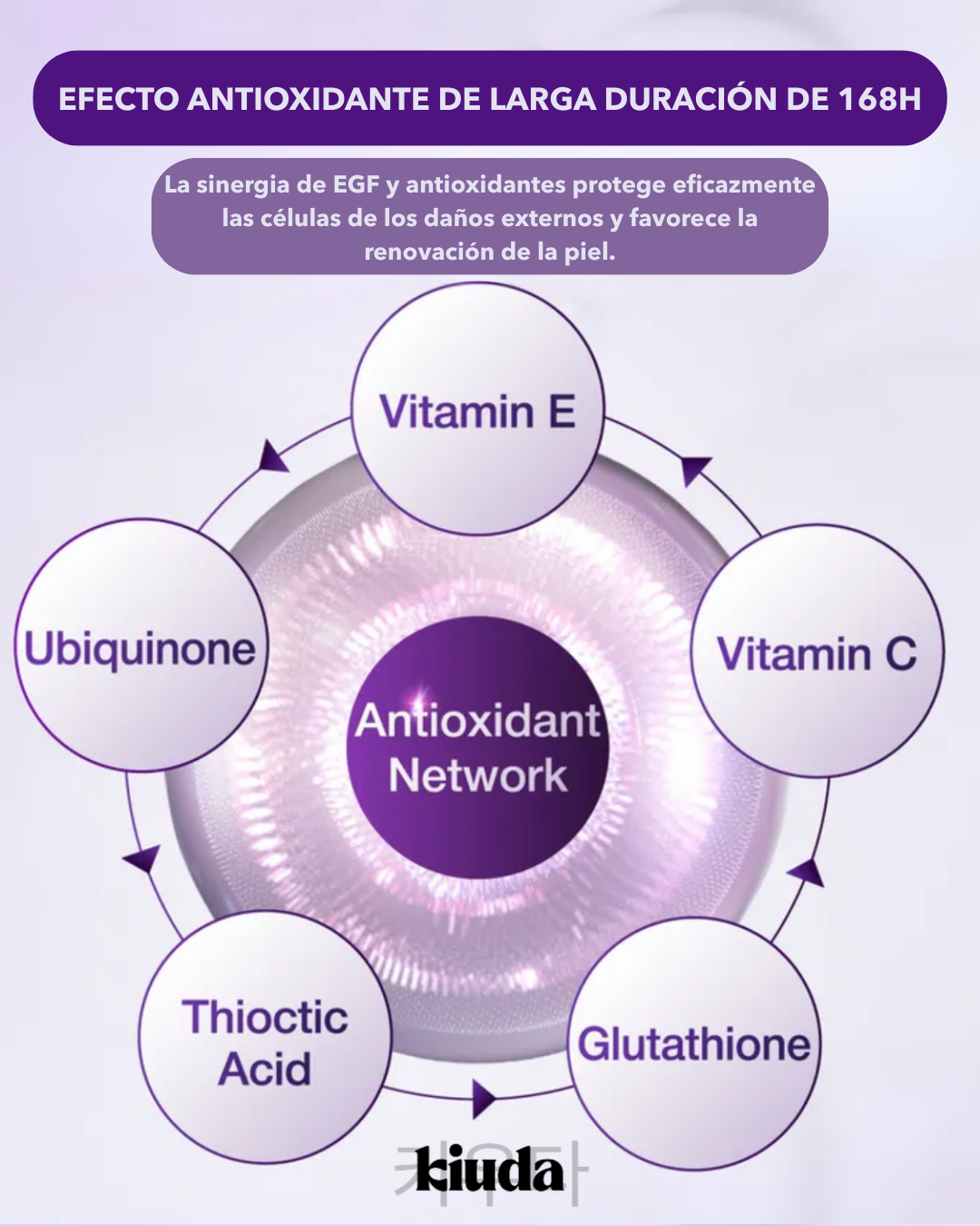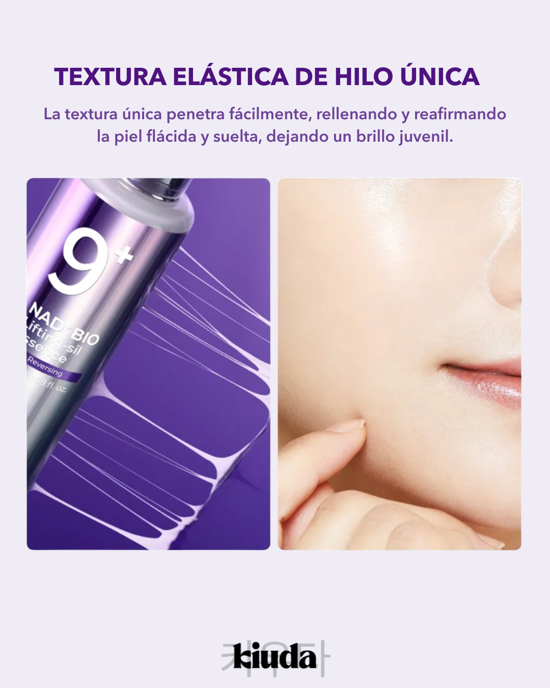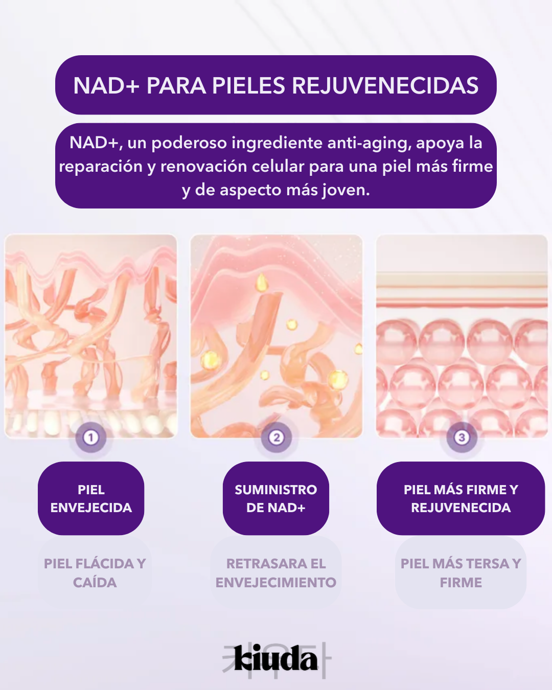 Formulada con NAD+, un ingrediente antiedad que mejora la renovación celular, estimula la producción de colágeno y promueve la reparación de la piel, junto con 50 tipos de péptidos para rellenar y reafirmar la piel.