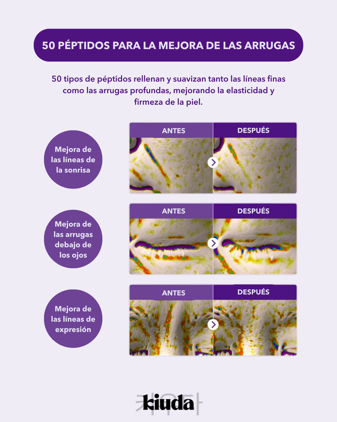 Clínicamente probado para reducir 11 tipos de arrugas (líneas de frente, líneas de expresión, patas de gallo, surcos lacrimales, líneas en la nariz, líneas de labios, líneas de sonrisa, líneas de marioneta, arrugas del entrecejo, arrugas del mentón y líneas del cuello) en solo 4 semanas.